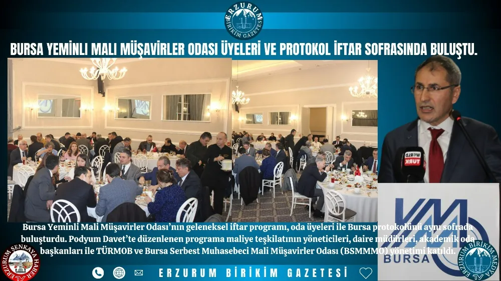 Bursa Yeminli Mali Müşavirler Odası’nın geleneksel iftar programı, oda üyeleri ile Bursa protokolünü aynı sofrada buluşturdu. Podyum Davet’te düzenlenen programa maliye teşkilatının yöneticileri, daire müdürleri, akademik oda başkanları ile TÜRMOB ve Bursa Serbest Muhasebeci Mali Müşavirler Odası (BSMMMO) yönetimi katıldı.