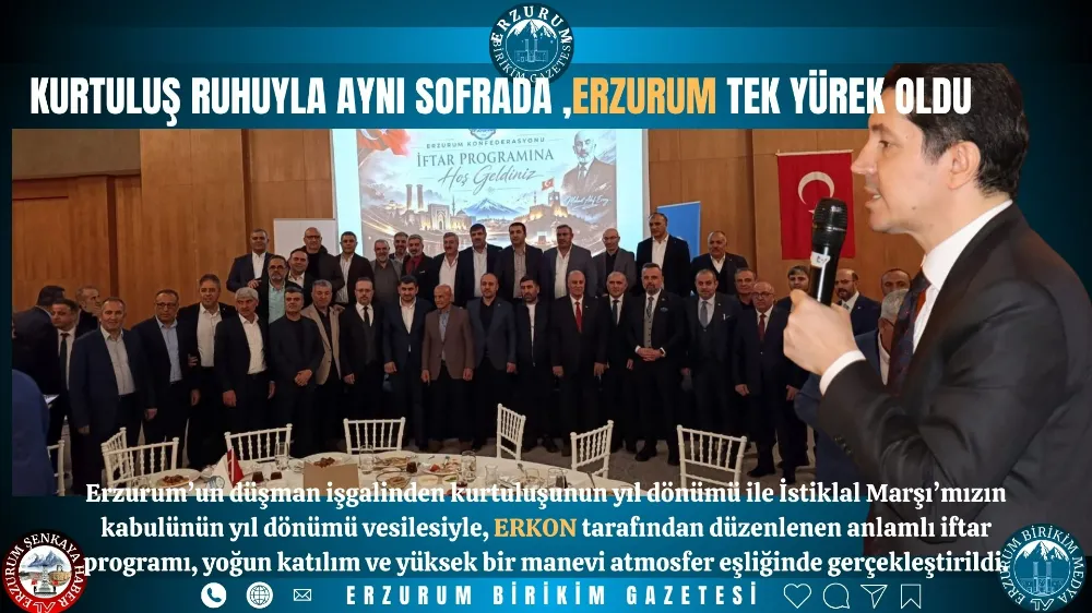 Erzurum’un düşman işgalinden kurtuluşunun yıl dönümü ile İstiklal Marşı’mızın kabulünün yıl dönümü vesilesiyle, ERKON tarafından düzenlenen anlamlı iftar programı, yoğun katılım ve yüksek bir manevi atmosfer eşliğinde gerçekleştirildi.