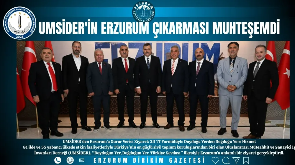 81 ilde ve 55 yabancı ülkede etkin faaliyetleriyle Türkiye’nin en güçlü sivil toplum kuruluşlarından biri olan Uluslararası Müteahhit ve Sanayici İş İnsanları Derneği (UMSİDER), “Doyduğun Yer, Doğduğun Yer, Türkiye Sevdası” ilkesiyle Erzurum’a anlamlı bir ziyaret gerçekleştirdi.